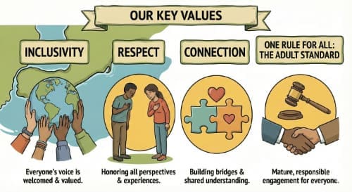 - One Rule For All: “The Adult Standard”, Respect, Integrity, Emphaty, and Assume Good Faith
